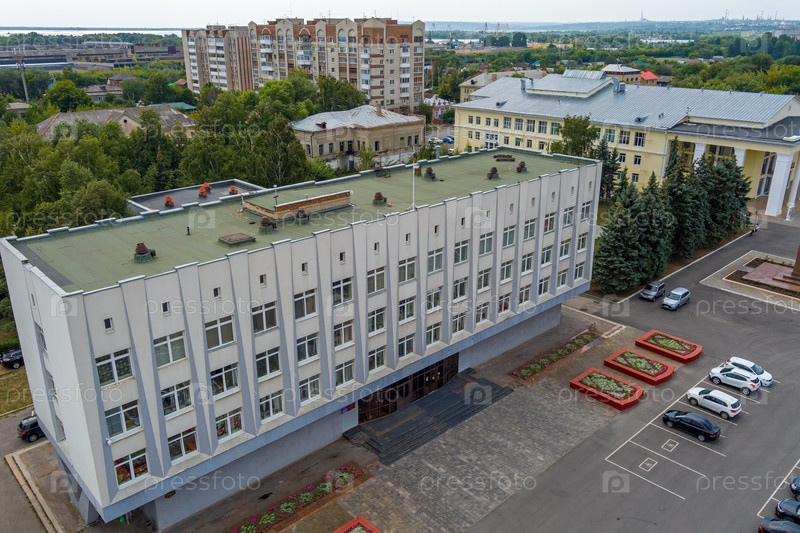 Сызрань, Россия. Центральная площадь с администрацией. Панорама центральной части города с воздуха