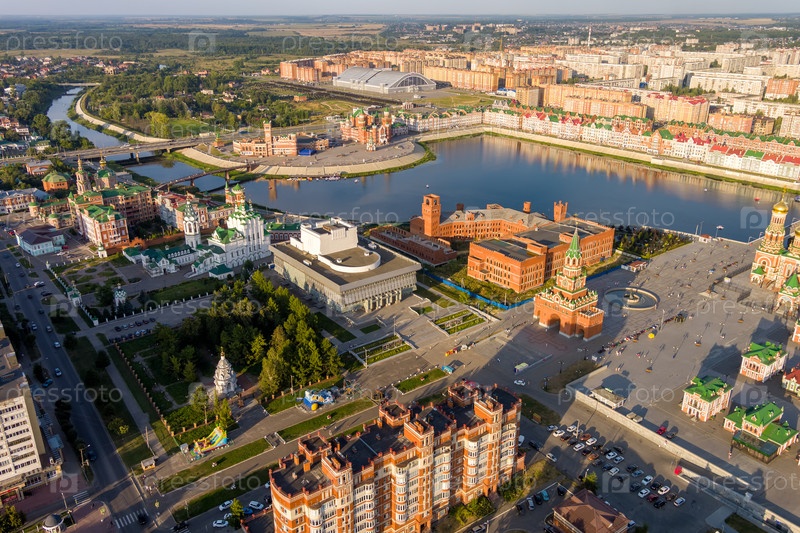 Йошкар-Ола, Россия. Панорама центра города во время заката. С высоты птичьего полета