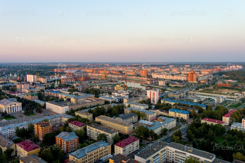 Йошкар-Ола, Россия. Панорама центра города во время заката. С высоты птичьего полета