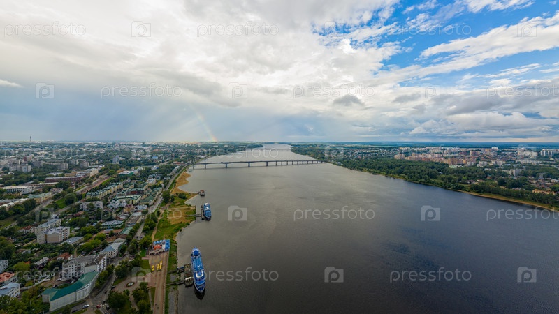 Кострома, Россия. Набережная реки Волги, Мост через реку. Круизные суда. Радуга в небе. С высоты птичьего полета