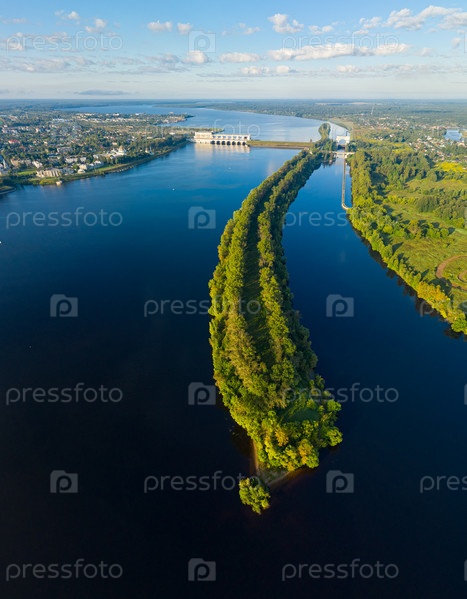Углич, Россия. Панорама набережной реки Волги, Угличская ГЭС, Шлюз