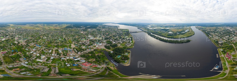 Углич, Россия. Набережная реки Волги, Шлюзовые ворота Угличского водохранилища. Гидроэлектростанция. С высоты птичьего полета. Панорама 360