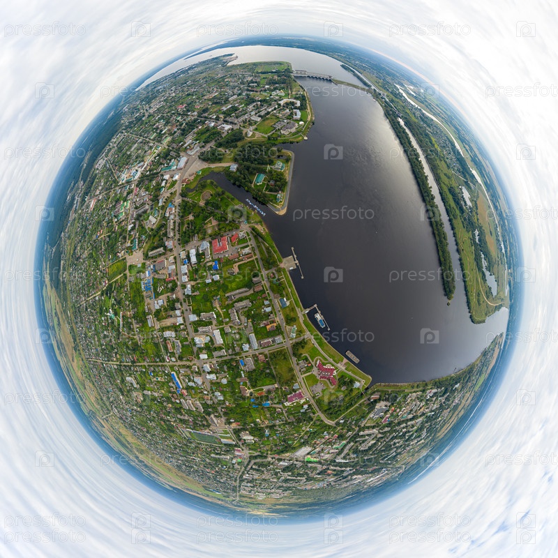 Углич, Россия. Набережная реки Волги, Шлюзовые ворота Угличского водохранилища. Гидроэлектростанция. С высоты птичьего полета. 360-градусный панорамный астероид