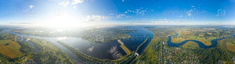 Углич, Россия. Угличский фунтовый замок. река Волга. Угличская ГЭС. Раннее утро. С высоты птичьего полета. Панорама 360