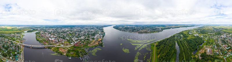 Кострома, Россия. Место слияния рек Костромы и Волги. С высоты птичьего полета. Панорама 360