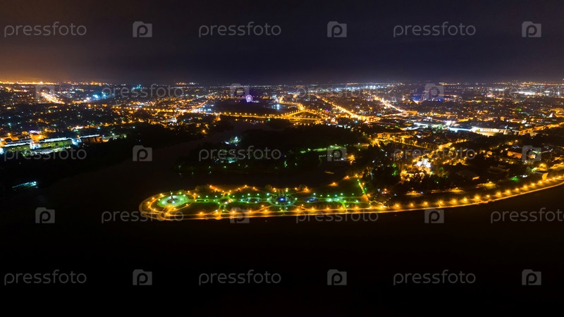 Ярославль, Россия. Панорамный вид на парк «Стрелка». Набережная реки Волги, впадение в реку Которосль. Вид с воздуха ночью