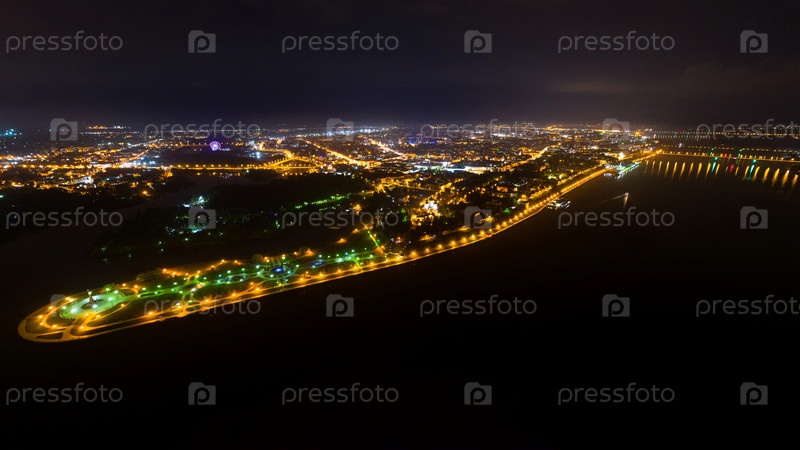 Ярославль, Россия. Панорамный вид на парк «Стрелка». Набережная реки Волги, впадение в реку Которосль. Вид с воздуха ночью