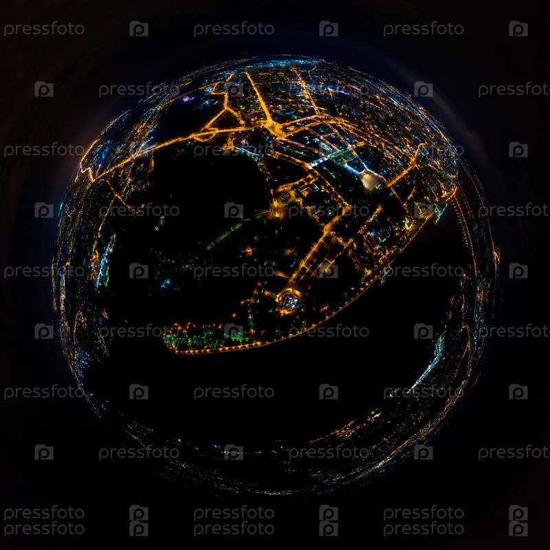 Ярославль, Россия. Исторический центр города. Набережная реки Волги Панорамный вид с воздуха ночью. 360-градусный панорамный астероид
