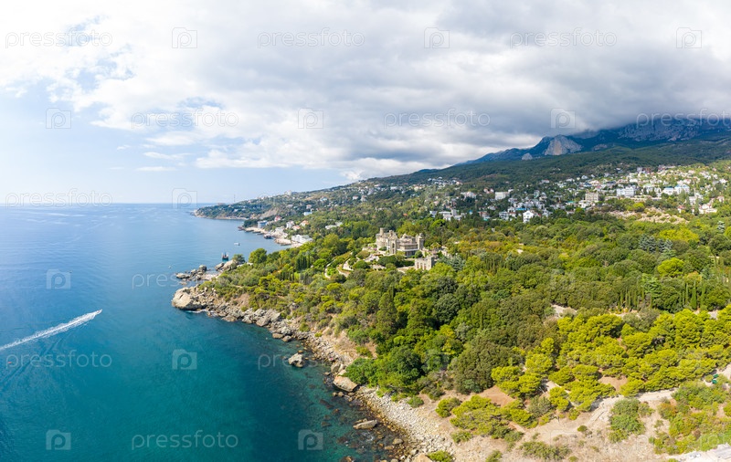 Алупка. Крым. Воронцовский дворец в свете яркого солнца. Лето. С высоты птичьего полета