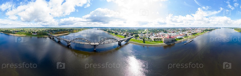 Рыбинск, Россия. Вид на набережную города Рыбинска и мост через Волгу. Аэрофотосъемка. Панорама 360