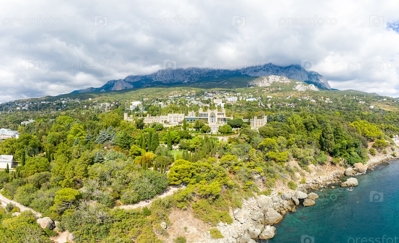 Алупка. Крым. Воронцовский дворец в свете яркого солнца. Лето. С высоты птичьего полета