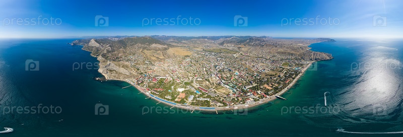 Судак, Крым. Генуэзская крепость. Вид на городские пляжи Судака со стороны Черного моря. Панорама 360. Вид с воздуха
