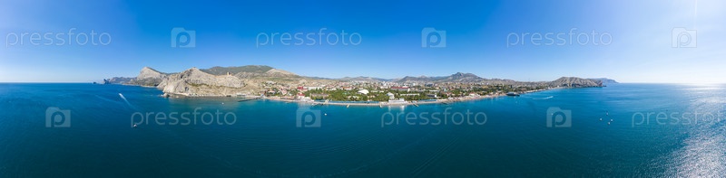 Судак, Крым. Генуэзская крепость. Вид на городские пляжи Судака со стороны Черного моря. С высоты птичьего полета