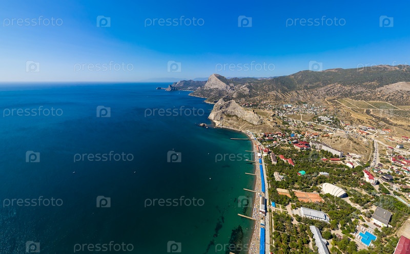 Судак, Крым. Генуэзская крепость. Вид на городские пляжи Судака со стороны Черного моря. С высоты птичьего полета