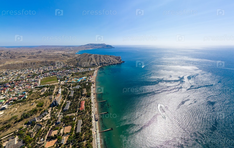 Судак, Крым. Вид на городские пляжи Судака со стороны Черного моря. С высоты птичьего полета