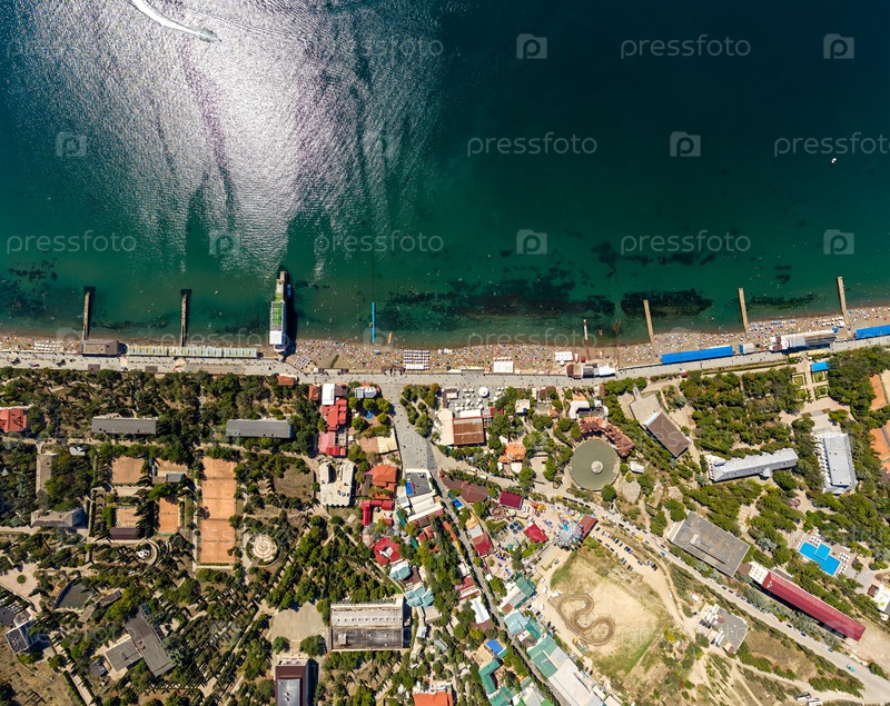 Судак, Крым. Вид на городские пляжи Судака со стороны Черного моря. С высоты птичьего полета