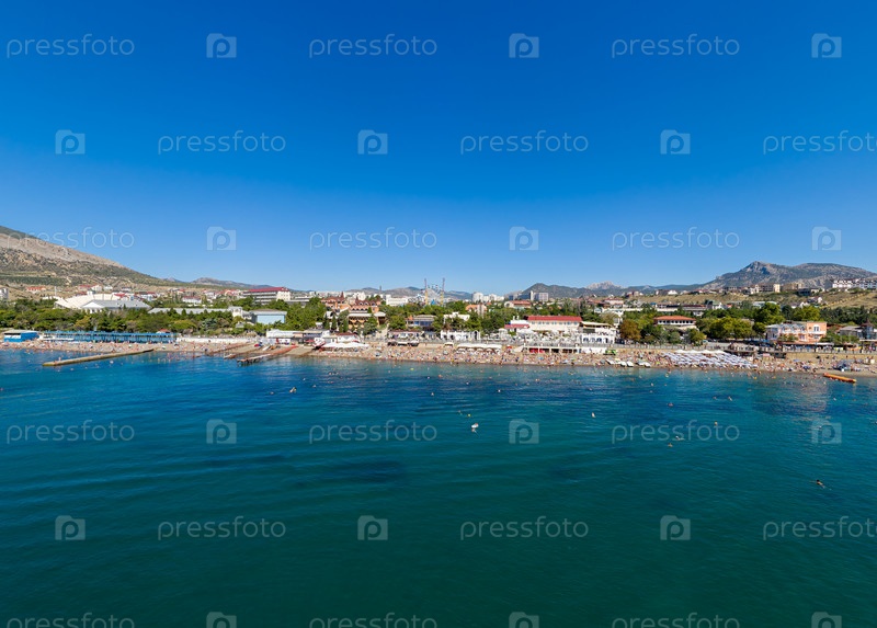 Судак, Крым. Вид на городские пляжи Судака со стороны Черного моря. С высоты птичьего полета
