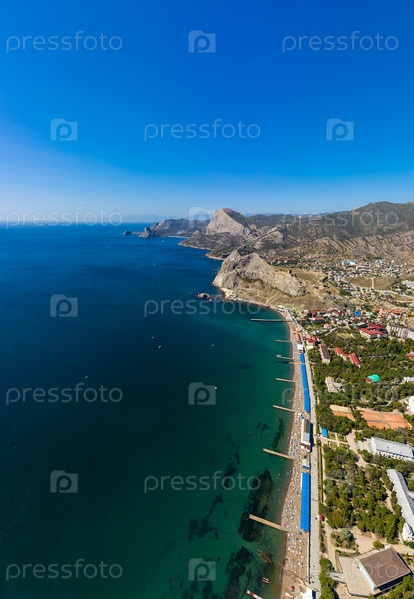 Судак, Крым. Генуэзская крепость. Вид на городские пляжи Судака со стороны Черного моря. С высоты птичьего полета