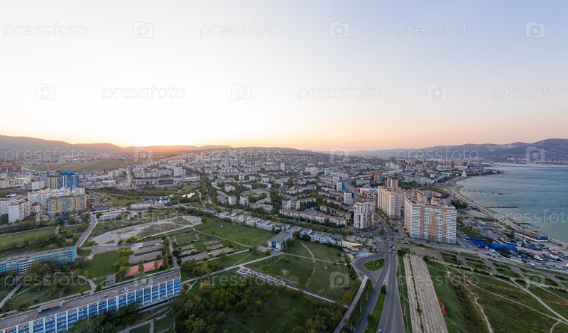 Новороссийск, Россия. Центральная часть города. Порт в Новороссийской бухте. Закат. С высоты птичьего полета