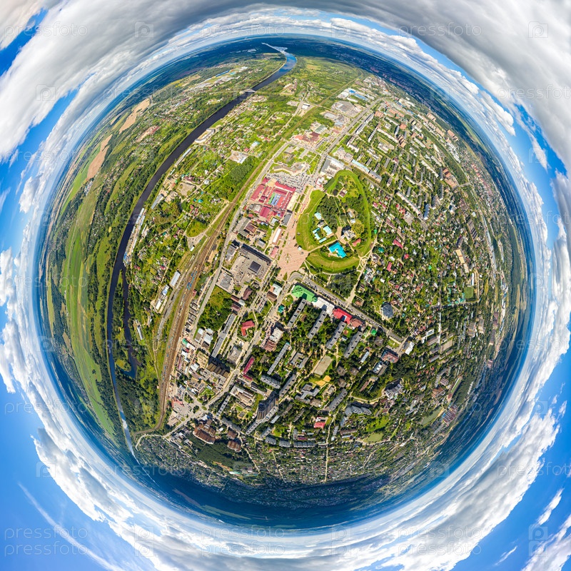 Дмитров, Россия. Центр города. Дмитриевский кремль. Московский канал. С высоты птичьего полета. 360-градусный панорамный астероид
