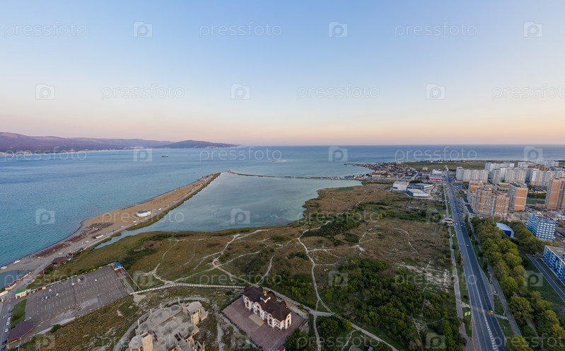 Новороссийск, Россия. Центральная часть города. Суджукская коса. Закат. С высоты птичьего полета