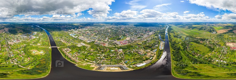 Дмитров, Россия. Центр города. Московский канал. С высоты птичьего полета. Панорама 360