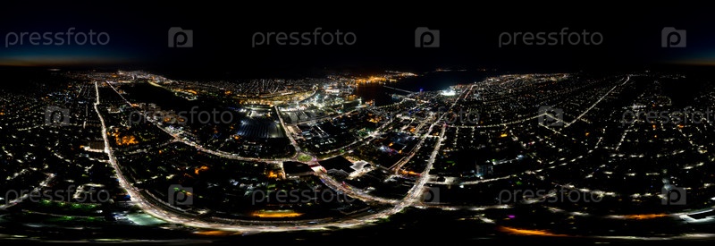 Новороссийск, Россия. Центральная часть города. Порт в Новороссийской бухте. Паорама 360. Вид с воздуха ночью
