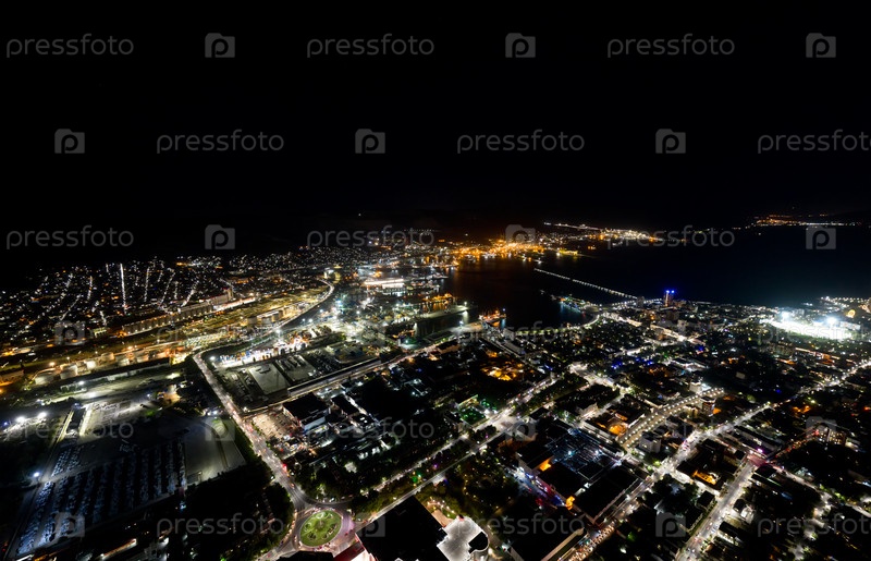 Новороссийск, Россия. Центральная часть города. Порт в Новороссийской бухте. Вид с воздуха ночью
