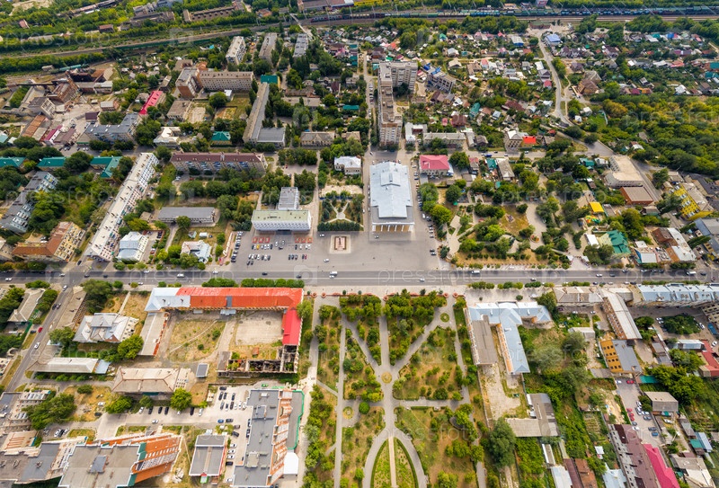 Сызрань, Россия. Центральная площадь с администрацией. Панорама центральной части города с воздуха