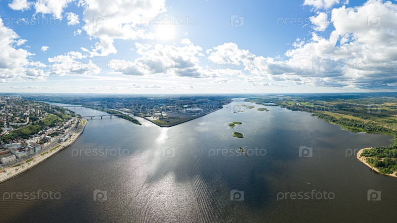 Нижний Новгород, Россия. Панорама города. Стрелка. Место слияния рек Оки и Волги. С высоты птичьего полета