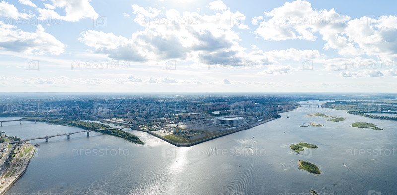 Нижний Новгород, Россия. Панорама города. Стрелка. Место слияния рек Оки и Волги. С высоты птичьего полета