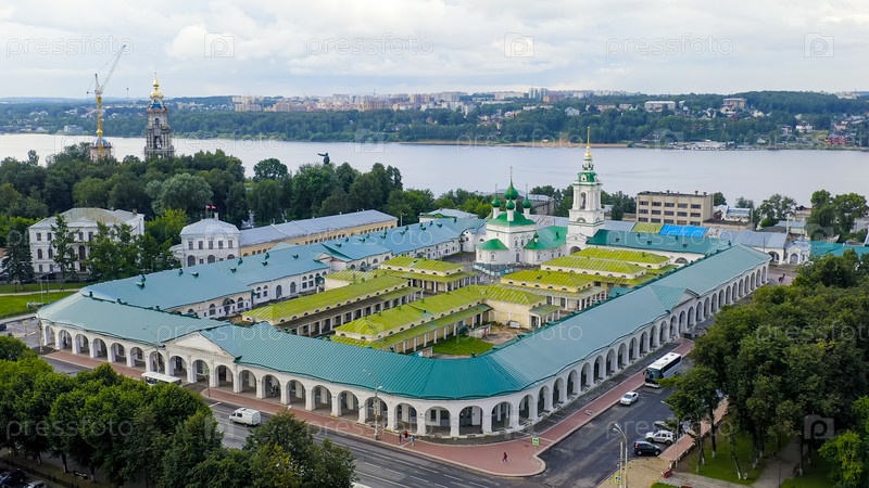 Кострома, Россия. Исторический центр города Костомы. Красные ряды, Спасская церковь в Рядах, вид с воздуха