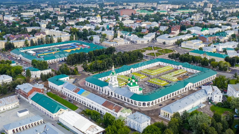 Кострома, Россия. Исторический центр города Костомы. Красные ряды, Спасская церковь в Рядах, вид с воздуха