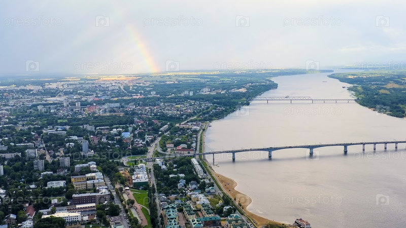 Кострома, Россия. Полет над историческим центром города Костромы. Радуга и река Волга, вид с воздуха