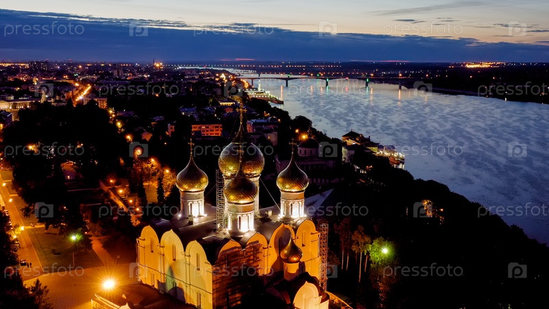 Ярославль, Россия. Собор Успения Пресвятой Богородицы (Успенский собор). Огни города после захода солнца, сумерки, вид с воздуха