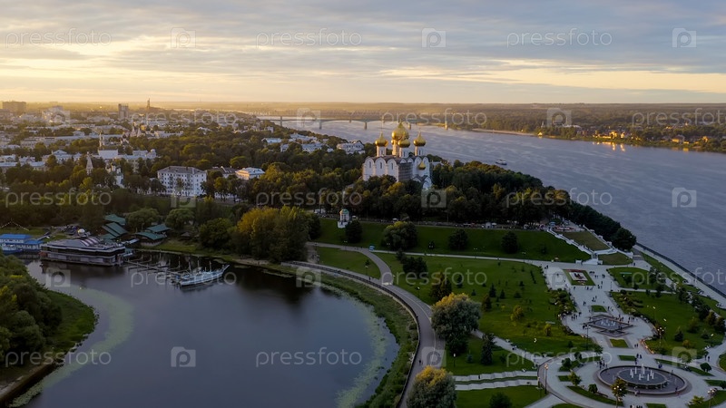 Ярославль, Россия. Стрелка, Которосль впадает в реку Волгу. Время заката, Вид с воздуха