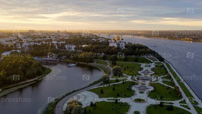 Ярославль, Россия. Стрелка, Которосль впадает в реку Волгу. Время заката, Вид с воздуха