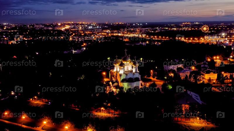Ярославль, Россия. Собор Успения Пресвятой Богородицы (Успенский собор). Огни города после захода солнца, сумерки, вид с воздуха