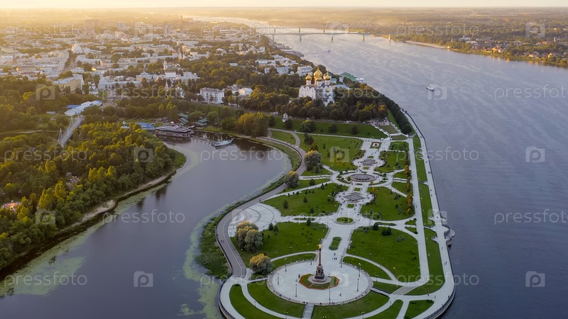 Ярославль, Россия. Стрелка, Которосль впадает в реку Волгу. Время заката, Вид с воздуха