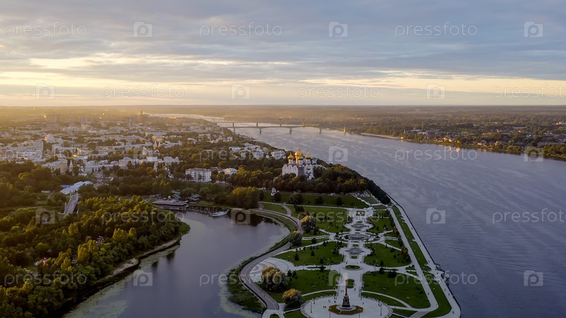 Ярославль, Россия. Стрелка, Которосль впадает в реку Волгу. Огни города после захода солнца, сумерки., вид с воздуха