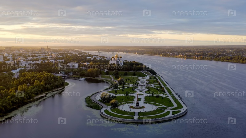 Ярославль, Россия. Стрелка, Которосль впадает в реку Волгу. Огни города после захода солнца, сумерки., вид с воздуха