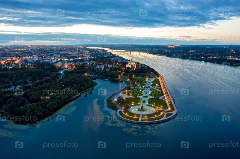 Ярославль, Россия. Парк Стрелка, реки Волга и Которосль, вид сверху. Сумерки