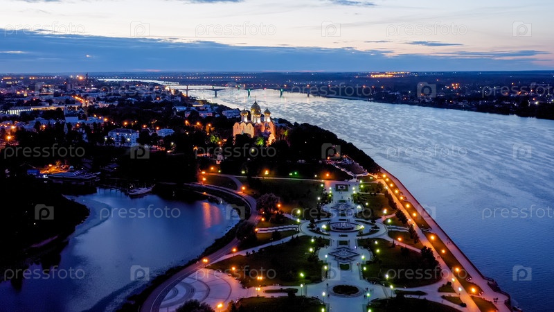 Ярославль, Россия. Стрелка, Которосль впадает в реку Волгу. Огни города после захода солнца, сумерки, вид с воздуха