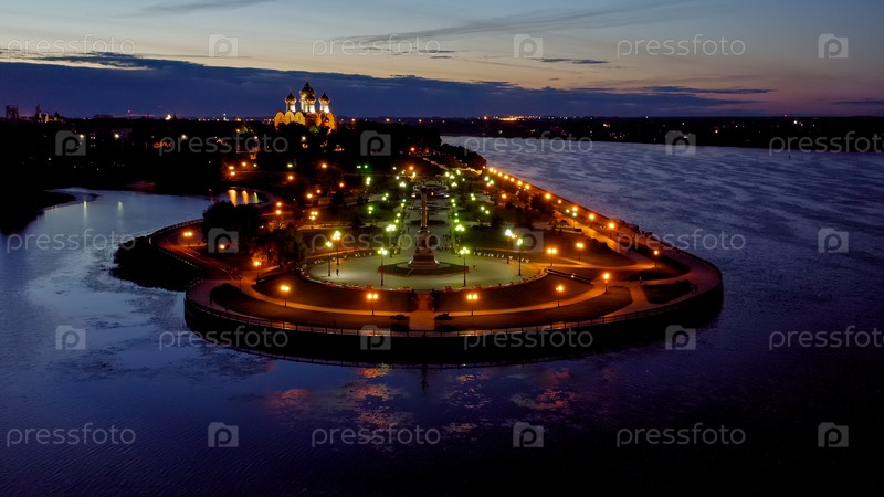 Ярославль, Россия. Стрелка, Которосль впадает в реку Волгу. Огни города после захода солнца, сумерки, вид с воздуха