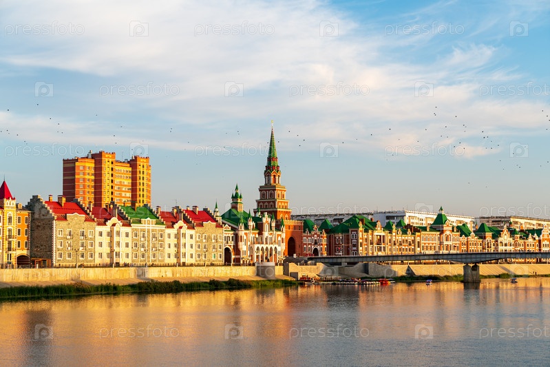 Йошкар-Ола, Россия. Панорама центра города. Река Малая Кокшага, набережная Брюгге, Театральный мост, Спасская башня