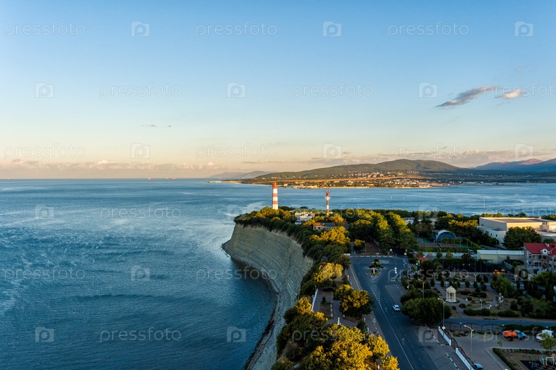 Геленджик, Россия. Маяк на толстом мысе. Геленджикская бухта. Летнее утро. С высоты птичьего полета