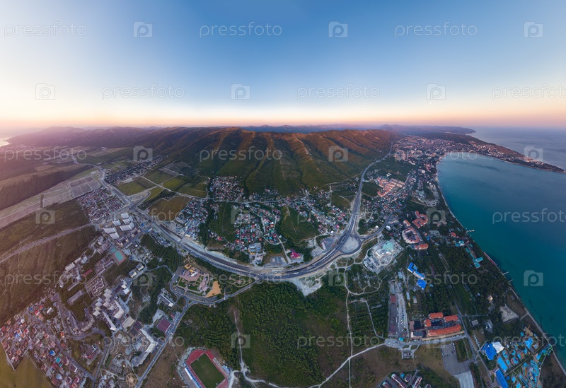 Геленджик, Россия. Панорамный вид на город и залив. Летний закат. С высоты птичьего полета