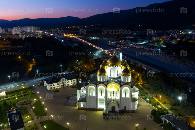 Геленджик, Россия. Собор Андрея Первозванного. Лето. Ночь. С высоты птичьего полета