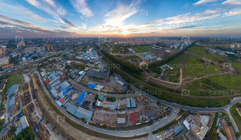 Краснодар, Россия. Панорама города летом. Парк в городе Краснодар. Футбольные площадки. Закат. С высоты птичьего полета