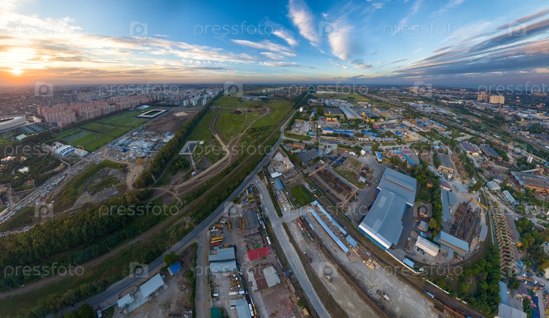 Краснодар, Россия. Панорама города летом. Парк в городе Краснодар. Футбольные площадки. Закат. С высоты птичьего полета